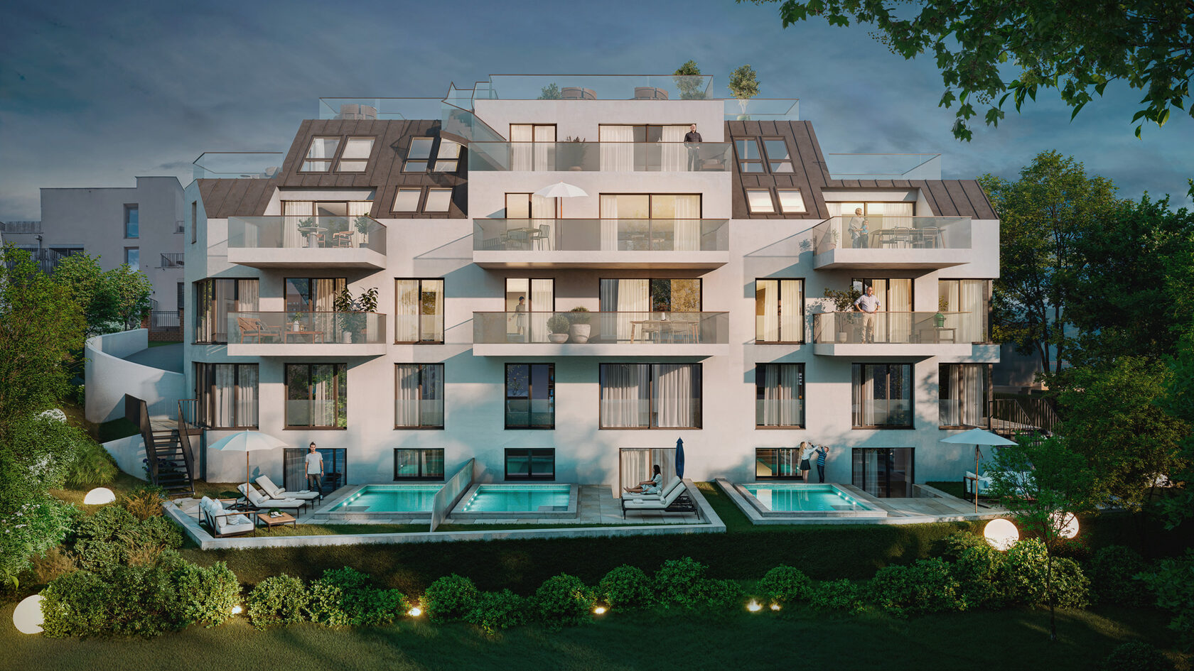 Ein besonderes Highlight sind zudem die Erdgeschosswohnungen mit privaten Gärten und teilweise eigenen Pools, die ein Höchstmaß an Privatsphäre bieten.